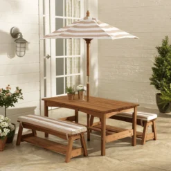 Kidkraft® Kinder Tuintafelset Met Bankjes, Kussens En Parasol, Beige Met Witte Strepen